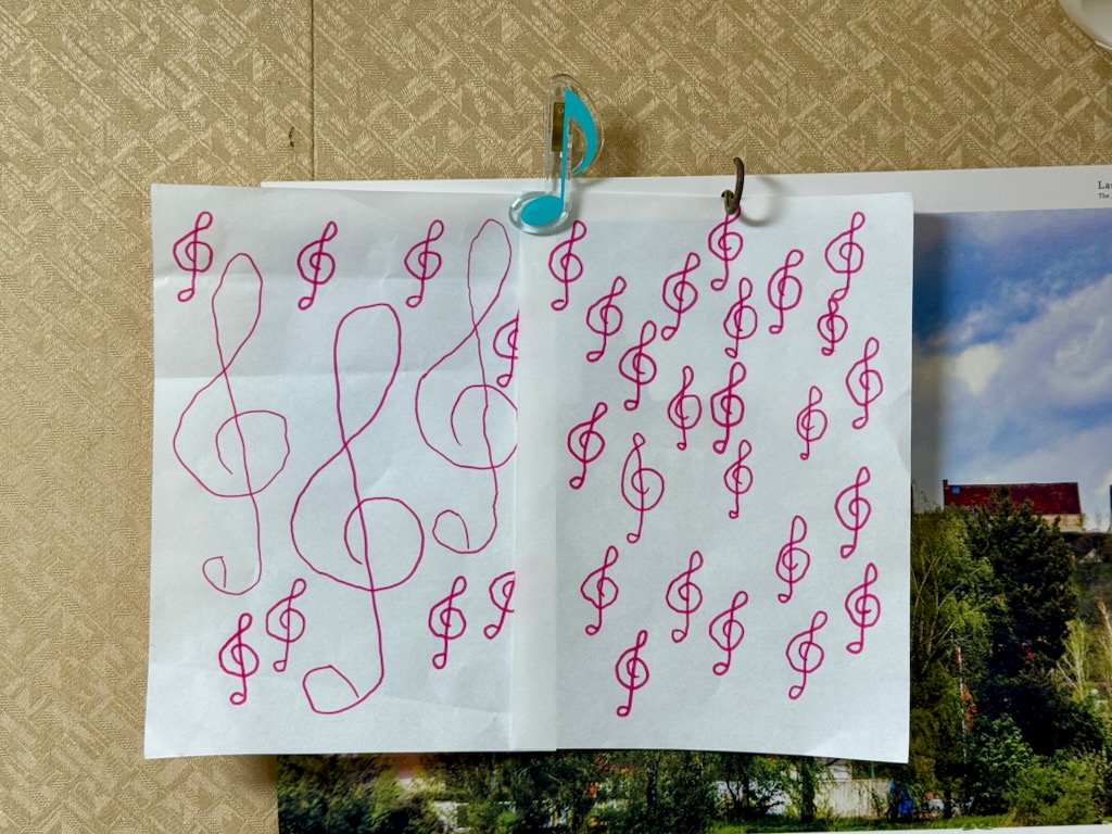 1年生の子がた〜くさんのト音記号を練習してきてくれました。お花が咲いてるみたいに大小様々。可愛いのでレッスン室に貼って皆さんに見て頂いています。「すご〜い!」「これがとっても上手!」「大きいのが上手ねえ」などなど良い反応ばかりです。いっぱい練習してきてくれてありがとう!