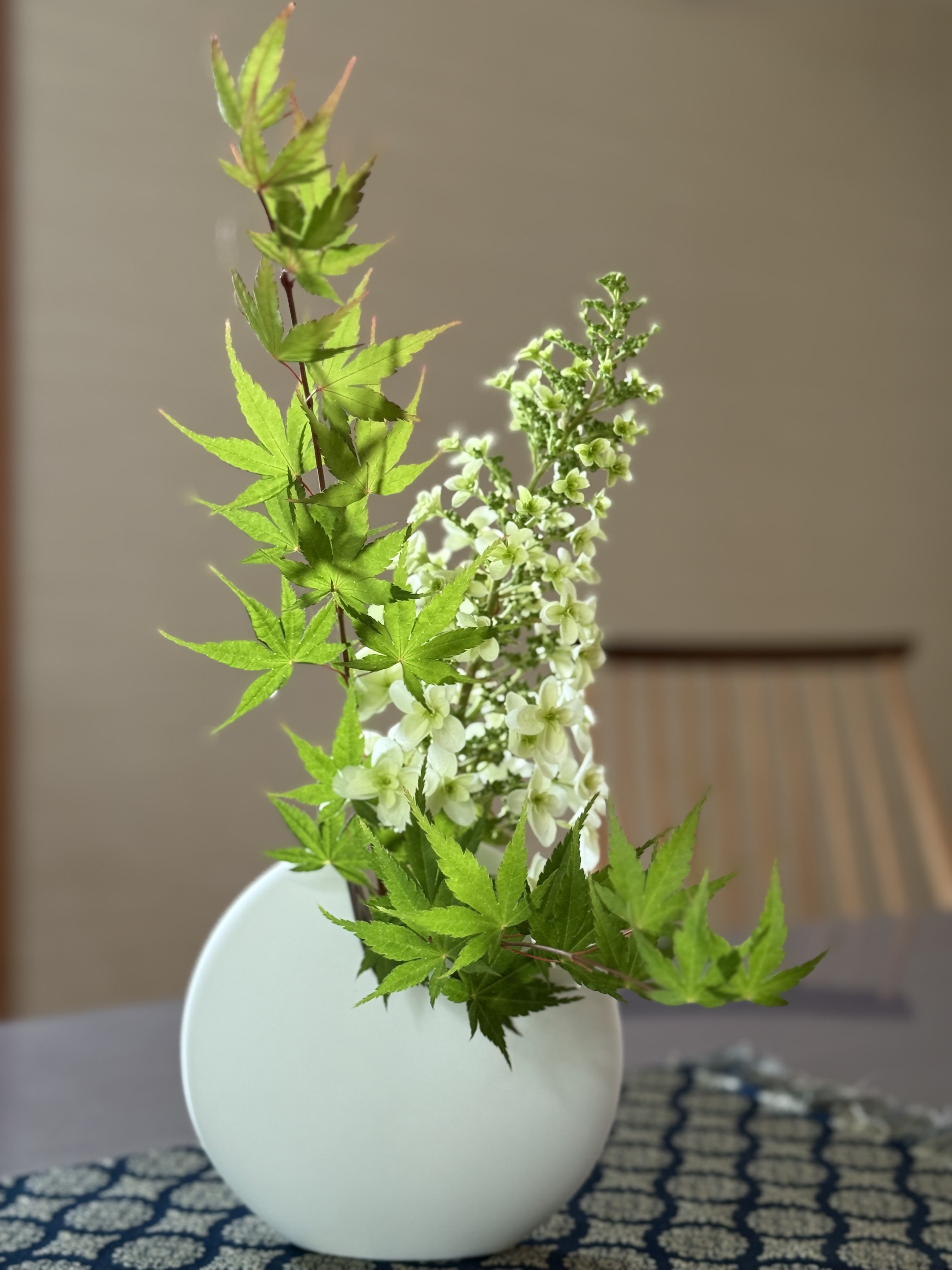 「あげる!」・・・実家教室の生徒さんが綺麗な花束をくれました。「庭に咲いているのをたった今積んできました。」とお母様。紫陽花の1種で三角アジサイというのだそうです。三角形の形にたくさんのお花が大小溢れそうなほど。綺麗で可愛い。そして花束を手に笑顔を向けてくれた教室生の園児さんの姿がキラキラしていました。ありがとう!実家教室と自宅教室に分けて楽しませていただいています。