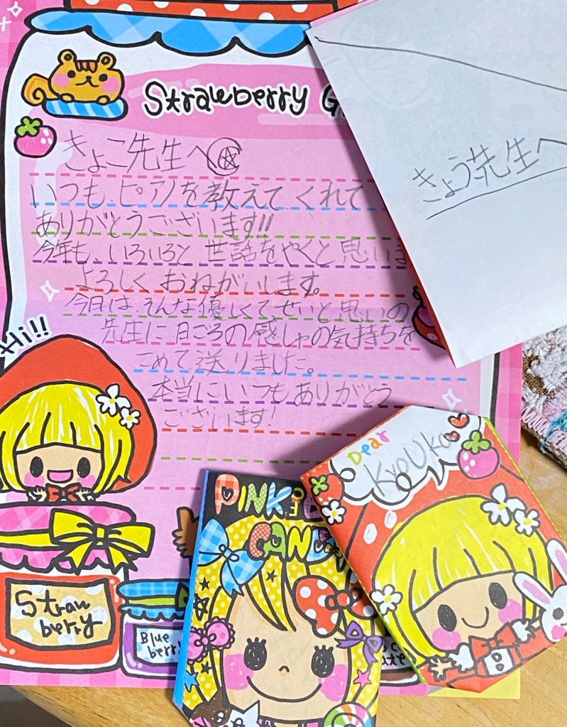 小学生の生徒さんからのお手紙のプレゼント。とってもとっても嬉しい!「生徒思いの先生に日頃の感謝の気持ちをこめて」と書いてくれています。そんな大人っぽい言葉づかいに驚きます。いつも「きょうこ先生」と呼んでくれる彼女。お手紙では「きょこ先生へ」となっているところがたまらなく可愛いです。