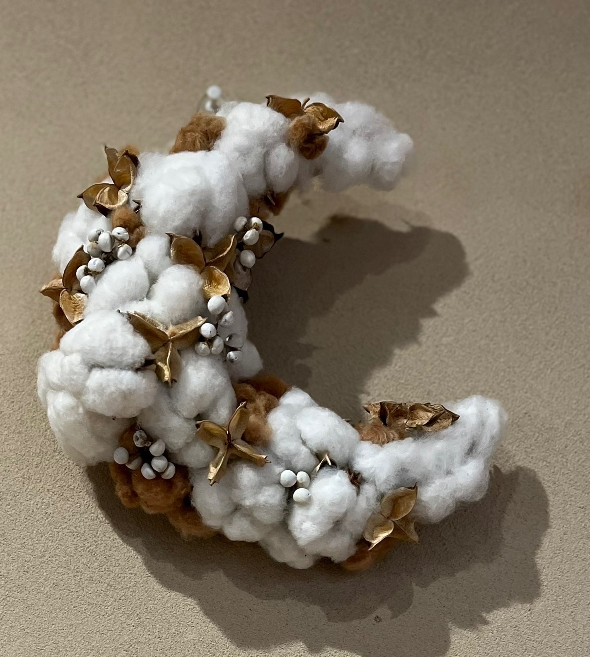 ふわふわの綿花と白のナンキンハゼで雪を表現した三日月リース「雪月花」・・・お花のMoeさんによる製作&ネーミングです。教室玄関に本日から飾っています。明日は佐賀も雪予報。いつも季節感にあふれた作品をありがとうございます。